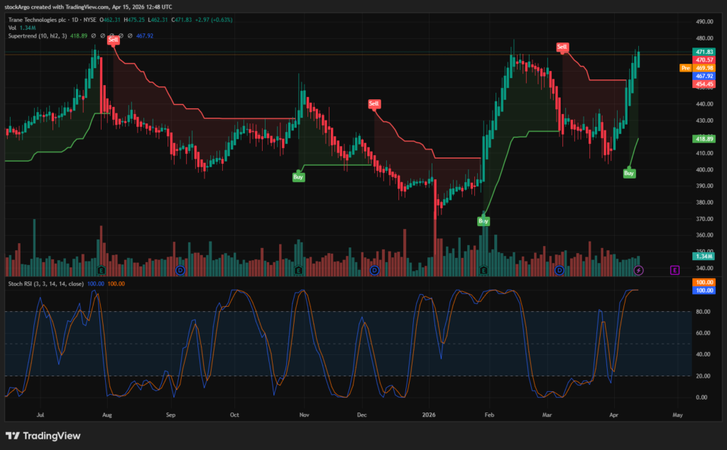 Your action plan is simple: Keep Trane Technologies at the very top of your watchlist. Wait for the Stoch RSI to dramatically cool down over the coming days or weeks. When the price dips to test the green SuperTrend support line, and the Stoch RSI crosses bullishly from the oversold region, that is your golden ticket to scale into one of the most vital industrial companies of the 21st century.